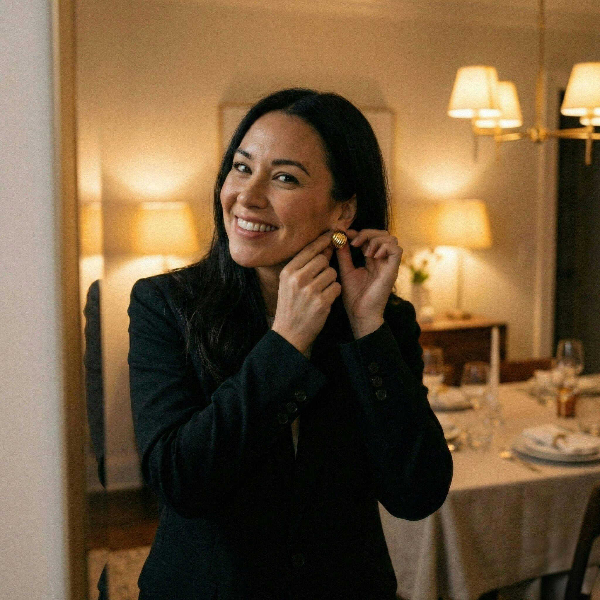 Date Night: The 14K Gold pair brings a warm, romantic glow to a little black dress.